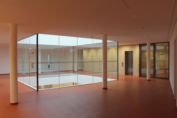 Übersichtlich gestaltete Grundrisse und gut belichtete Aufenthaltsräume mit vielfältigen Blickbeziehungen nach Innen wie nach Außen, unterstützen die offene, transparente Raumatmosphäre und machen in den beiden Gebäuden gesundes und konzentriertes Lernen möglich.