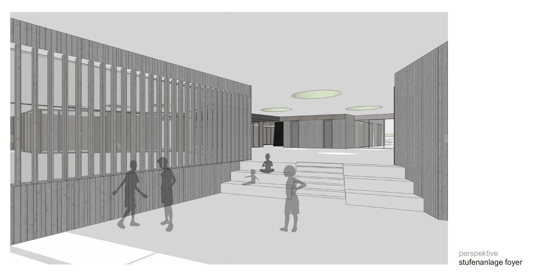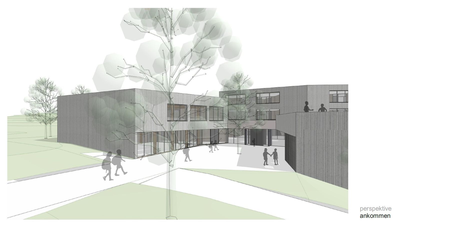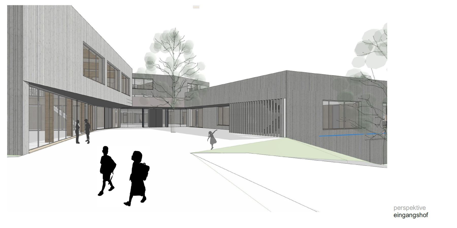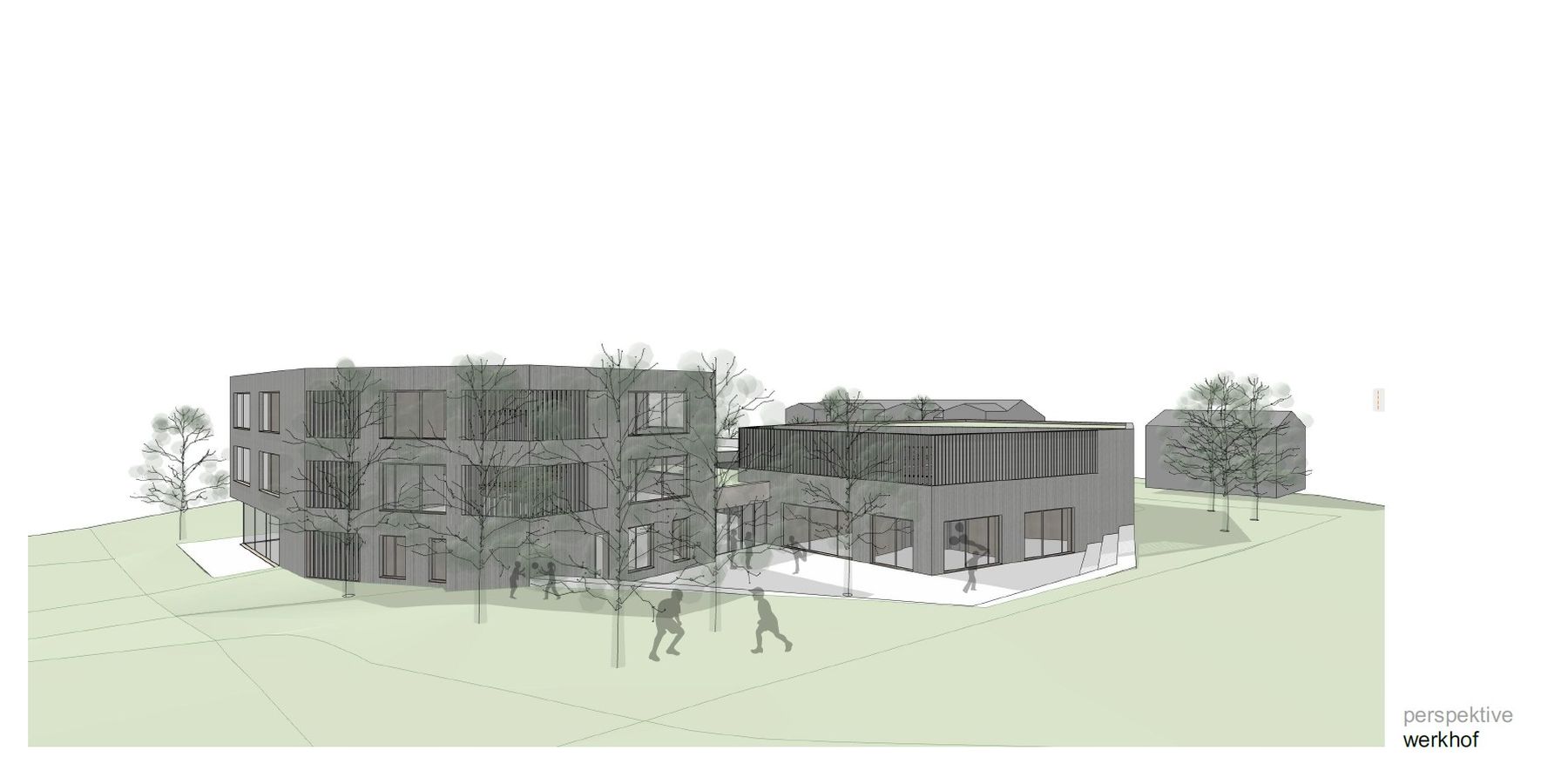 Für die Gemeinde St. Wolfgang am Salzkammergut wurde eine Machbarkeitsstudie für den Neubau einer Volksschule, einem Kindergarten und einer Turnhalle erstellt. Diese Nutzungen werden in polygonalen Baukörpern untergebracht, die um eine zentrale Mitte, den „Dorfplatz“ angeordnet werden und als eigenständige Nutzungen ablesbar bleiben. Durch die Zwischenräume auf dem „Dorfplatz“ und die eingezogenen Loggien verbindet sich das Gebäude mit der Landschaft. Die Gebäude werden in der Höhe entsprechend dem durchfließenden Gelände gestaffelt und fügen sich somit in Topographie und in die Nachbarschaft ein.